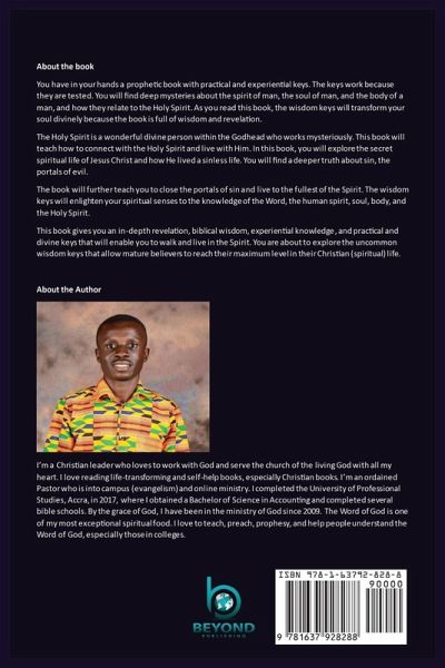 You have in your hands a prophetic book with practical and experiential keys. The keys work because they are tested. You will find deep mysteries about the spirit of man, the soul of man, and the body of a man, and how they relate to the Holy Spirit. As you read this book, the wisdom keys will transform your soul divinely because the book is full of wisdom and revelation. The Holy Spirit is a wonderful divine person within the Godhead who works mysteriously. This book will teach how to connect with the Holy Spirit and live with Him. In this book, you will explore the secret spiritual life of Jesus Christ and how He lived a sinless life. You will find a deeper truth about sin, the portals of evil. The book will further teach you to close the portals of sin and live to the fullest of the Spirit. The wisdom keys will enlighten your spiritual senses to the knowledge of the Word, the human spirit, soul, body, and the Holy Spirit. This book gives you an in-depth revelation, biblical wisdom, experiential knowledge, and practical and divine keys that will enable you to walk and live in the Spirit. You are about to explore the uncommon wisdom keys that allow mature believers to reach their maximum level in their Christian (spiritual) life.