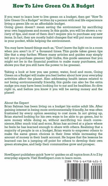 If you want to learn how to live green on a budget, then get "How To Live Green On a Budget" written by a person with real life experience living a green life on an affordable budget. Going green doesn’t mean saving the environment by sacrificing your own happiness and money. In this guide, you will be shown a variety of tips, and most of them don’t require you to purchase any new items. In fact, they are mostly habit changes that will put more money in your pocket, while helping the environment. You may have heard things such as, "Don't leave the light on in a room when you aren’t in it" a thousand times. This guide takes green tips like that a step further. Where many articles and guides may simply tell you to purchase greener light bulbs, this guide assumes that you might not be in the financial position to make many purchases, and shows you that you still have the power to be greener. Taking a look at how you use power, water, food and more, Going Green on a Budget will make you feel better about how your everyday activities affect the planet. Also addressing health issues related to not being environmentally friendly, this guide can also be the extra nudge you may have been looking for to eat and be healthier. So dive right in, and before you know it you will be saving money and the planet! About the Expert Brian Salman has been living on a budget his entire adult life. After gaining interest in being more environmentally friendly, he was often frustrated by every option seeming to cost more. In not giving up, Brian started looking for his own ways to be able to go green, but to save money while doing so, without sacrificing too much convenience. After much trial and error, Brian has arrived at a place where he feels he has learned enough to share with others. Realizing that a majority of people is on a budget, Brian wants to empower others to make the same green choices in their lives while increasing the amount of money in their bank account. He hopes that the lessons he learned can be a jumping off point for others to develop their own green strategies, and help their communities grow and prosper. HowExpert publishes quick 'how to' guides on all topics from A to Z by everyday experts.