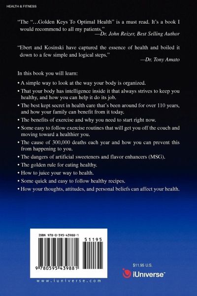 In this book you will learn: A simple way to look at the way your body is organized. The one body system that is in charge of virtually everything that happens inside you. That your body has intelligence inside it that always strives to keep you healthy, and how you can help it do its job. The best kept secret in health care that's been around for over 110 years, and how your family can benefit from it today. What the real cause of most disease is and how to prevent it. The benefits of exercise and why you need to start right now. Some easy to follow exercise routines that you can get you off the couch and moving towards a more healthy you. Why 300,000 people die each year because of obesity related diseases. Why artificial sweeteners are dangerous and why you need to get them out of your kitchen. Learn the golden rule to healthy eating. Learn how to juice your way to health. Get some recipes to help you eat healthy even if you don't have a lot of time. Learn how to sleep your way to great health. Find out how your thoughts and attitudes can affect your health.