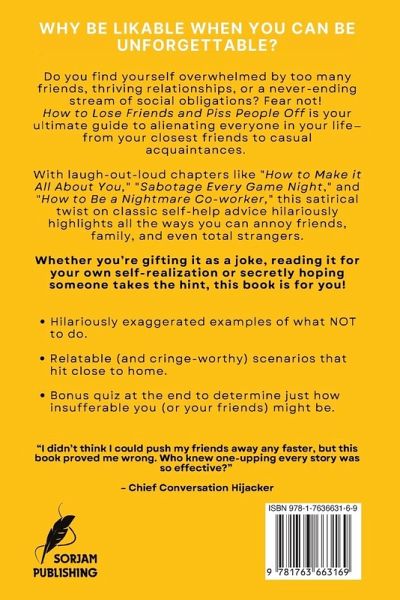 Tired of having too many friends? Struggling under the weight of healthy relationships? Constantly invited to social gatherings you'd rather avoid? Fear not! How to Lose Friends & P*ss People Off is the ultimate backhanded reverse psychology approach to self-improvement that shows you exactly what not to do if you want to maintain your social life. With laugh-out-loud chapters like "How to Make it All About You," "Sabotage Every Game Night," and "How to Be a Nightmare Co-worker," this satirical twist on classic self-help advice hilariously highlights all the ways you can alienate friends, family, and even total strangers. Whether you're gifting it as a joke, reading it for your own self-realization or secretly hoping someone takes the hint, this book is for you! Hilariously exaggerated examples of what NOT to do. Relatable (and cringe-worthy) scenarios that hit close to home. Bonus quiz at the end to determine just how insufferable you (or your friends) might be. Perfect for lovers of humor, social satire, and gift books that make people go, "Wait... is this about me?"