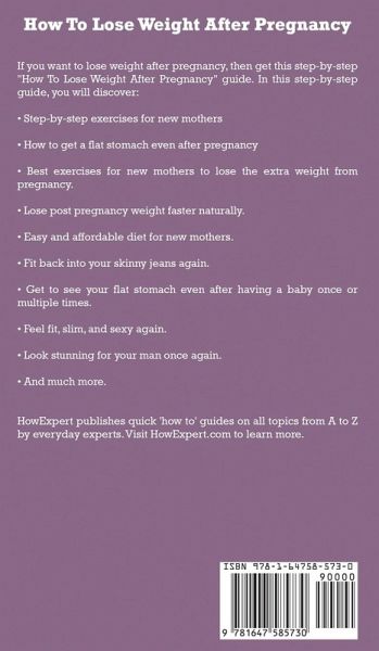 If you want to lose weight after pregnancy, then get this step-by-step "How To Lose Weight After Pregnancy" guide. In this step-by-step guide, you will discover: - Step-by-step exercises for new mothers - How to get a flat stomach even after pregnancy - Best exercises for new mothers to lose the extra weight from pregnancy. - Lose post pregnancy weight faster naturally. - Easy and affordable diet for new mothers. - Fit back into your skinny jeans again. - Get to see your flat stomach even after having a baby once or multiple times. - Feel fit, slim, and sexy again. - Look stunning for your man once again. - And much more. HowExpert publishes quick 'how to' guides on all topics from A to Z by everyday experts.