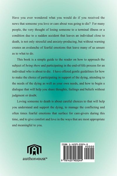 Have you ever wondered what you would do if you received the news that someone you love or care about was going to die? For many people, the very thought of losing someone to a terminal illness or a condition due to a sudden accident that leaves an individual close to death, is not only stressful and anxiety-producing, but without warning creates an avalanche of fearful emotions that leave many of us unsure as to what to do. This book is a simple guide to the reader on how to approach the subject of being there and participating in the end-of-life process for an individual who is about to die. Loving someone to death is about careful choices to understand and support the dying, and to manage the conflicting, and often times fearful emotions, that surface for care-givers during this time.