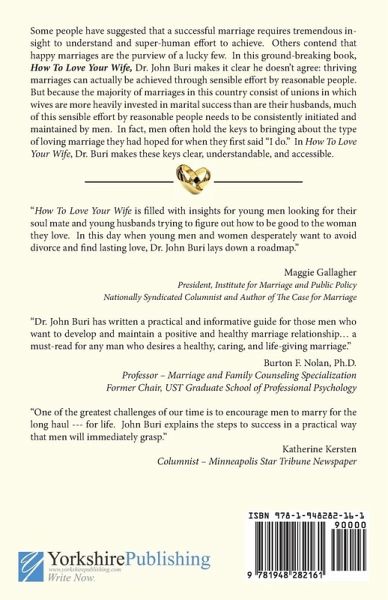 Some people have suggested that a successful marriage requires tremendous insight to understand and super-human effort to achieve. Others contend that happy marriages are the purview of a lucky few. In this ground-breaking book, How To Love Your Wife, Dr. John Buri makes it clear he doesn't agree: thriving marriages can actually be achieved through sensible effort by reasonable people. But because the majority of marriages in this country consist of unions in which wives are more heavily invested in marital success than are their husbands, much of this sensible effort by reasonable people needs to be consistently initiated and maintained by men. In fact, men often hold the keys to bringing about the type of loving marriage they had hoped for when they first said "I do." In How To Love Your Wife, Dr. Buri makes these keys clear, understandable, and accessible.