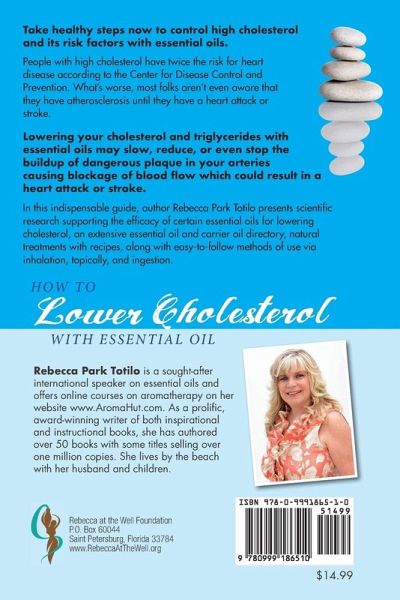 Take healthy steps now to control high cholesterol and its risk factors with essential oils. People with high cholesterol have twice the risk for heart disease according to the Center for Disease Control and Prevention. What's worse, most folks aren't even aware that they have atherosclerosis until they have a heart attack or stroke. Lowering your cholesterol with essential oils may slow, reduce, or even stop the buildup of dangerous plaque in your arteries causing blockage of blood flow which could result in a heart attack or stroke. In this indispensable guide, author Rebecca Park Totilo presents scientific research supporting the efficacy of certain essential oils for lowering cholesterol, an extensive essential oil and carrier oil directory, natural treatments with recipes, along with easy-to- follow methods of use via inhalation, topically, and ingestion.