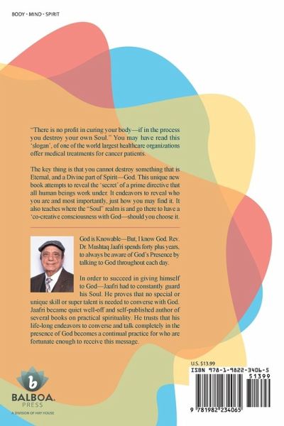 "There is no profit in curing your body-if in the process you destroy your own Soul." You may have read this 'slogan', of one of the world largest healthcare organizations offer medical treatments for cancer patients. The key thing is that you cannot destroy something that is Eternal, and a Divine part of Spirit-God. This unique new book attempts to reveal the 'secret' of a prime directive that all human beings work under. It endeavors to reveal who you are and most importantly, just how you may find it. It also teaches where the "Soul" realm is and go there to have a 'co-creative consciousness with God-should you choose it.
