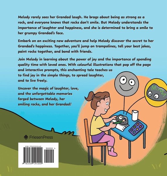 Melody rarely sees her grandad laugh. He brags about being as strong as rock, and everyone knows that rocks don't smile. But Melody understands the importance of laughter and happiness, and she is determined to bring a smile to her grumpy grandad's face. Embark on an exciting new adventure and help Melody discover the secret to her grandad's happiness. Together, you'll jump on trampolines, tell your best jokes, paint rocks together, and bond with friends. Join Melody in learning about the power of joy and the importance of spending quality time with loved ones. With colourful illustrations that pop off the page and interactive prompts, this enchanting tale teaches us to find joy in the simple things, to spread laughter, and to live freely. Uncover the magic of laughter, love, and the unforgettable memories forged between Melody, her smiling rocks, and her grandad!