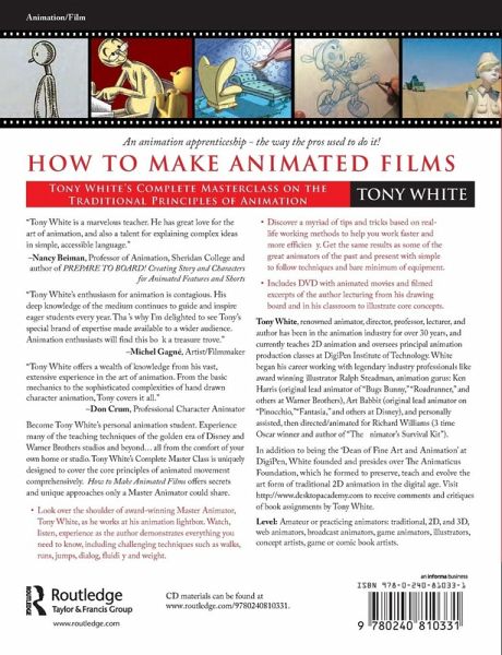 Become Tony White's personal animation student. Experience many of the teaching techniques of the golden era of Disney and Warner Brothers studios and beyond.all from the comfort of your own home or studio. Tony White's Animation Master Class is uniquely designed to cover the core principles of animated movement comprehensively. How to Make Animated Films offers secrets and unique approaches only a Master Animator could share. Includes hands-on Tutorials, demonstrations and final sample animations. . Whether you want to become a qualified animator of 2D, 3D, Flash or any other form of animation, Tony White's foundations bring you closer to that goal. The downloadable resources are invaluable, in that readers are not only taught principles and concepts in the book, they are able to see them demonstrated in action in the movies.