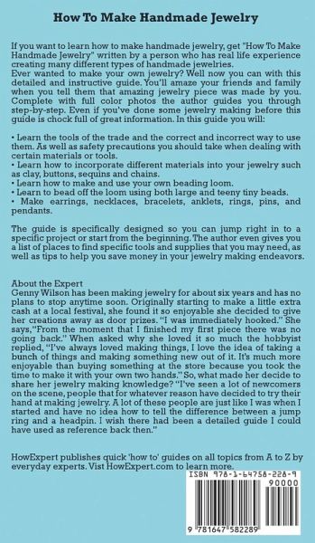 If you want to learn how to make handmade jewelry, get "How To Make Handmade Jewelry" written by a person who has real life experience creating many different types of handmade jewelries. Ever wanted to make your own jewelry? Well now you can with this detailed and instructive guide. You’ll amaze your friends and family when you tell them that amazing jewelry piece was made by you. Complete with full color photos the author guides you through step-by-step. Even if you’ve done some jewelry making before this guide is chock full of great information. In this guide you will: - Learn the tools of the trade and the correct and incorrect way to use them. As well as safety precautions you should take when dealing with certain materials or tools. - Learn how to incorporate different materials into your jewelry such as clay, buttons, sequins and chains. - Learn how to make and use your own beading loom. - Learn to bead off the loom using both large and teeny tiny beads. - Make earrings, necklaces, bracelets, anklets, rings, pins, and pendants. The guide is specifically designed so you can jump right in to a specific project or start from the beginning. The author even gives you a list of places to find specific tools and supplies that you may need, as well as tips to help you save money in your jewelry making endeavors. About the Expert Genny Wilson has been making jewelry for about six years and has no plans to stop anytime soon. Originally starting to make a little extra cash at a local festival, she found it so enjoyable she decided to give her creations away as door prizes. "I was immediately hooked." She says,"From the moment that I finished my first piece there was no going back." When asked why she loved it so much the hobbyist replied, "I’ve always loved making things, I love the idea of taking a bunch of things and making something new out of it. It’s much more enjoyable than buying something at the store because you took the time to make it with your own two hands." So, what made her decide to share her jewelry making knowledge? "I’ve seen a lot of newcomers on the scene, people that for whatever reason have decided to try their hand at making jewelry. A lot of these people are just like I was when I started and have no idea how to tell the difference between a jump ring and a headpin. I wish there had been a detailed guide I could have used as reference back then." HowExpert publishes quick 'how to' guides on all topics from A to Z by everyday experts.