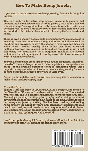 If you want to learn how to make hemp jewelry, then this is the guide for you. This is a highly informative step-by-step guide with pictures that demonstrates the fundamentals of hemp jewelry making in a fun and whimsical way. The expert author really connects with the reader on a personal level to give a treasure trove of information: from tools that are needed, to the history of macramé, to choosing the best beads and hemp. There is even a section dedicated to dying hemp. The main focus is in teaching basic macramé knots, along with other techniques such as braiding and weaving, to give the reader a well-rounded base on which to start making jewelry of his or her own. More advanced methods, however, are touched on throughout the guide in ways that can easily be understood by a beginner. Included are several techniques for making adjustable jewelry as well, for those who might want to sell their creations. You will also find numerous tips from the author on general technique, based off of years of experience, in this complete and comprehensive guide for the average beginner. There is something within these pages for everyone, whether they have been making jewelry for years or have never made a piece of jewelry in their lives. As you go through the book you will see how easy it is to learn how to make hemp jewelry, step by step. About the Expert Tabitha Clark was born in LaGrange, GA. As a preteen, she moved to the Carrollton, GA area and has been settled there since. Now married with one son, she is a fulltime homemaker, homeschooler and artist. She enjoys painting, writing, photography and cooking; or almost anything that obliges a creative flair. In her spare time, Tabitha focuses her energy on jewelry making. She has been making and selling hemp jewelry for about 10 years, and continually experiments with new knots, designs, and beads to craft unique, one of a kind pieces. She is passionate about creating and welcomes every opportunity to share her art and techniques with the world. HowExpert publishes quick 'how to' guides on all topics from A to Z by everyday experts.