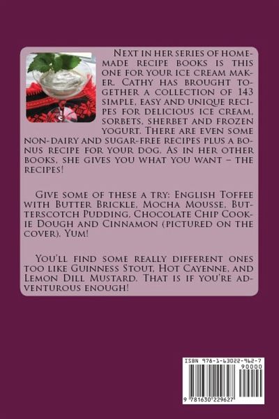 Next in her series of homemade recipe books is this one for your ice cream maker. Cathy has brought together a collection of 143 simple, easy and unique recipes for delicious ice cream, sorbets, sherbet and frozen yogurt. There are even some non-dairy and sugar-free recipes plus a bonus recipe for your dog. As in her other books, she gives you what you want - the recipes!