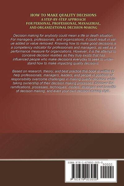 Decision making for anybody could mean a life or death situation. For managers, professionals, and organizations, it could result in value-added or value removed. Knowing how to make good decisions is a competency indicator for professionals and managers, as well as a performance measure for organizations. However, it is the attempt to conceive decision realities as they truly exist that has influenced people who make decisions every day to seek to understand how to make impacting quality decisions. Based on research, theory, and best practice this book is written to help professionals, managers, leaders, and people in positions of responsibility overcome challenges in making quality decisions while taking ownership of their decision making processes. Discover the ramifications, processes, techniques, models, strategies, and benefits of decision making, and even your own decision-making style.