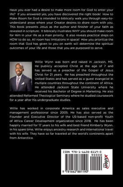 Have you ever had a desire to make more room for God to enter your life? If you answered yes, you have discovered the right book! How to Make Room for God is intended to biblically walk you through easy-to-understand areas where your Creator desires to share room with you. This book presents Jesus as the author and finisher of your faith as revealed in scripture. It biblically illustrates WHY you should make room for Him in your life as a main priority. It also reveals practical steps on HOW to do so. All room has limitations in space! How you prioritize the room that God has given to you on earth will determine the spiritual outcomes of your life and those that you are purposed to serve. Willie Wynn was born and raised in Jackson, MS. He publicly accepted Christ at the age of 7 and has served as a preacher of the Gospel of Jesus Christ for 21 years. He has preached throughout the United States and has served as a guest evangelist in multiple countries throughout the continent of Africa. He attended Jackson State University where he received his Bachelor of Degree in Marketing. He also attended Reformed Theological Seminary where he studied coursework for a year after his undergraduate studies. Willie has worked in corporate America as sales executive and management professional since 2005. He has also served as the Founder and Executive Director of the US-based non-profit Youth of Africa Career Development organization since 2018. He has been happily married for 17 years to his wife and best friend Kimberly Wynn. In his spare time, Willie enjoys ancestry research and international travel with his wife. They have so far traveled all the world's continents apart from Antarctica.