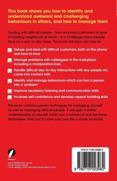 Dealing with difficult people - from awkward customers at work to irritating neighbours at home - is a challenge many people face on a day-to-day basis. This book will show you how to: - Defuse and deal with difficult customers, both on the phone and face to face; - Manage problems with colleagues in the workplace, including a manipulative boss; - Handle difficult day-to-day interactions with any people we come into contact anywhere; - Identify and manage behaviours which can turn a person into a 'problem';Improve necessary listening and communication skills; - Increase self confidence and develop rapport building skills. This book contains some proven techniques for managing yourself as well as managing difficult people. If you gain a better understanding of yourself, build your confidence and use these techniques, then you'll make your life a whole lot easier.
