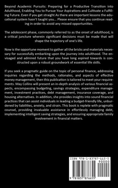 Beyond Academic Pursuits: Preparing for a Productive Transition into Adulthood, Enabling You to Pursue Your Aspirations and Cultivate a Fulfilling Future. Even if you get straight As there are important lessons the educational system hasn't taught you... Please ensure that you continue reading in order to avoid any missed opportunities. The adolescent phase, commonly referred to as the onset of adulthood, is a critical juncture wherein significant decisions must be made that will shape the trajectory of one's life. Now is the opportune moment to gather all the bricks and materials necessary for successfully embarking upon the journey into adulthood. The envisaged and admired future that you have long aspired towards is constructed upon a robust groundwork of essential life skills. If you seek a pragmatic guide on the topic of personal finance, addressing inquiries regarding the methods, rationales, and aspects of effective money management, then this publication is tailored to meet your requirements. May Collins will present an in-depth analysis of various financial aspects, encompassing budgeting, savings strategies, expenditure management, investment practices, debt management, insurance coverage, and housing alternatives. In addition, she provides insights into sound financial practices that can assist individuals in leading a budget-friendly life, unburdened by liabilities, anxiety, and strain. This book is replete with pragmatic counsel, providing invaluable assistance in effortlessly managing debt, implementing intelligent saving strategies, and ensuring appropriate family involvement in financial matters.