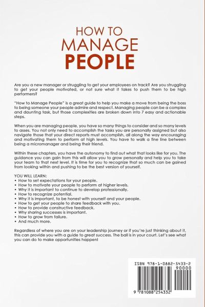 Are you a new manager or struggling to get your employees on track? Are you struggling to get your people motivated, or not sure what it takes to push them to be high performers? "How to Manage People" is a great guide to help you make a move from being the boss to being someone your people admire and respect. Leading people can be a complex and daunting task, but those complexities are broken down into 7 easy and actionable steps. When you are managing people, you have so many things to consider and so many levels to asses. You not only need to accomplish the tasks you are personally assigned but also navigate those that your direct reports must accomplish, all along the way encouraging and motivating them to perform at high levels. You have to walk a fine line between being a micromanager and being their friend. Within these chapters, you have the autonomy to find out what that looks like for you. The guidance you can gain from this will allow you to grow personally and help you to take your team to that next level. It is time for you to recognizing that so much can be gained from looking within and pushing to be the best version of yourself. YOU WILL LEARN:How to set expectations for your people. How to motivate your people to perform at higher levels. Why it is important to continue to develop professionally. How to recognize potential. Why it is important, to be honest with yourself and your people. How to get your people to share feedback with you. How to provide constructive feedback. Why sharing successes is important. How to grow from failure. And much more. Regardless of where you are on your leadership journey or if you're just thinking about it, this can provide you with a guide to great success. The ball is in your court. Let's see what you can do to make opportunities happen!