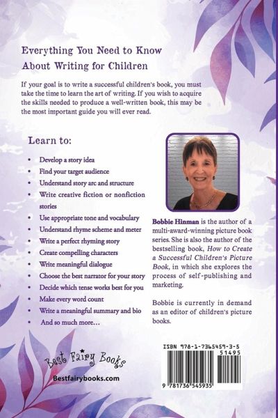 Everything you need to know about writing for children. If your goal is to write a successful children's book, you must take the time to learn the art of writing. If you wish to acquire the skills needed to produce a well-written book, this may be the most important guide you will ever read. Learn to:Develop a story idea Find your target audience Understand story arc and structure Write creative fiction or nonfiction stories Use appropriate tone and vocabulary Understand rhyme scheme and meter Write a perfect rhyming story Create compelling characters Write meaningful dialogue Choose the best narrator for your story Decide which tense works best for you Make every word count Write a meaningful summary and bio And so much more... Grab your copy now and begin writing your dream children's book!