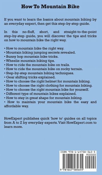 If you want to learn the basics about mountain biking by an everyday expert, then get this step-by-step guide. In this no-fluff, short, and straight-to-the-point step-by-step guide, you will discover the tips and tricks on how to mountain bike the right way. - How to mountain bike the right way. - Mountain biking jumping secrets revealed. - Bunny hop mountain bike tricks. - Wheelie mountain biking tips. - How to ride the mountain bike on trails. - How to ride the mountain bike on rocky terrain. - Step-by-step mountain biking techniques. - Gear shifting tricks explained. - How to choose the right helmet for mountain biking. - How to choose the right clothing for mountain biking. - How to choose the right mountain bike for yourself. - Different type of mountain bikes explained. - How to stay in great shape for mountain biking. - How to maintain your mountain bike the easy and affordable way. HowExpert publishes quick 'how to' guides on all topics from A to Z by everyday experts.