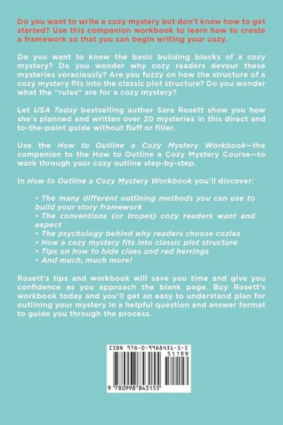 Do you want to write a cozy mystery but don't know how to get started? Use this companion workbook ( to learn how to create a framework so that you can begin writing your cozy. Do you want to know the basic building blocks of a cozy mystery? Do you wonder why cozy readers devour these mysteries voraciously? Are you fuzzy on how the structure of a cozy mystery fits into the classic plot structure? Do you wonder what the "rules" are for a cozy mystery? Do you wonder where you can bend the rules? Let successful cozy novelist Sara Rosett show you how she's planned and written 20 mysteries in this direct and to-the-point guide without fluff or filler. While each book is unique, every novel is built on a framework that is as old as storytelling itself. Cozy mysteries are no different. Discover the underlying structure that keeps cozy readers coming back for more. Use the How to Outline a Cozy Mystery Workbook-the companion to the How to Outline a Cozy Mystery Course-to work through your cozy outline step-by-step. In How to Outline a Cozy Mystery Workbook you'll discover: - The many different outlining methods you can use to build your story framework - The psychology behind why readers choose cozies - How a cozy mystery fits into classic plot structure - The conventions (or tropes) that cozy readers want and expect - Tips on how to hide clues and red herrings - And much, much more! Rosett's firsthand knowledge of cozy mystery structure and what cozy readers want can help you shape your idea into a novel. Rosett's tips and workbook will save you time and give you confidence as you approach the blank page. Buy Rosett's workbook today and you'll get an easy to understand plan for outlining your mystery in a helpful question and answer format to guide you through the process. Learn how to outline a cozy and start writing with Rosett's easy-to-follow workbook today!