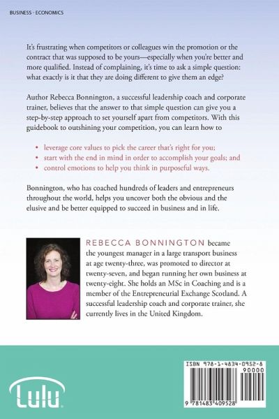 It's frustrating when competitors or colleagues win the promotion or the contract that was supposed to be yours-especially when you're better and more qualified. Instead of complaining, it's time to ask a simple question: what exactly is it that they are doing different to give them an edge? Author Rebecca Bonnington, a successful leadership coach and corporate trainer, believes that the answer to that simple question can give you a step-by-step approach to set yourself apart from competitors. With this guidebook to outshining your competition, you can learn how to leverage core values to pick the career that's right for you; start with the end in mind in order to accomplish your goals; and control emotions to help you think in purposeful ways. Bonnington, who has coached hundreds of leaders and entrepreneurs throughout the world, helps you uncover both the obvious and the elusive and be better equipped to succeed in business and in life.