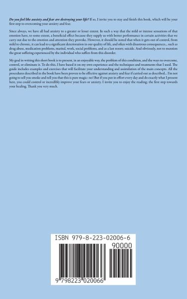 Do you feel like anxiety and fear are destroying your life? If so, I invite you to stay and finish this book, which will be your first step to overcoming your anxiety and fear. Since always, we have all had anxiety to a greater or lesser extent. In such a way that the mild or intense sensations of that emotion have, to some extent, a beneficial effect because they supply us with better performance in certain activities that we carry out due to the emotion and attention they provoke. However, it should be noted that when it gets out of control, from mild to chronic, it can lead to a significant deterioration in our quality of life, and often with disastrous consequences... such as drug abuse, medication problems, marital, work, social problems, and as a last resort; suicide. And obviously, not to mention the great suffering experienced by the individual who suffers from this disorder. My goal in writing this short book is to present, in an enjoyable way, the problem of this condition, and the ways to overcome, control, or eliminate it. To do this, I have based it on my own experience and the techniques and treatments that I used. The guide includes examples and exercises that will facilitate your understanding and assimilation of the main concepts. All the procedures described in the book have been proven to be effective against anxiety and fear if carried out as described... I'm not going to sell you smoke and tell you that this is pure magic: no! But if you put in effort every day and do exactly what I present here, you could control or incredibly improve your fears or anxiety. I invite you to enjoy the reading; the first step towards your healing. Thank you very much.