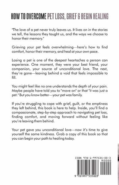 "The love of a pet never truly leaves us. It lives on in the stories we tell, the lessons they taught us, and the ways we choose to honor their memory." Grieving your pet feels overwhelming-here's how to find comfort, honor their memory, and heal at your own pace. ¿¿¿¿ Losing a pet is one of the deepest heartaches a person can experience. One moment, they were your best friend, your companion, your source of unconditional love. The next, they're gone-leaving behind a void that feels impossible to fill. You might feel like no one understands the depth of your pain. Maybe people have told you to "move on" or that "it was just a pet." But you know better-your pet was family. If you're struggling to cope with grief, guilt, or the emptiness they left behind, this book is here to help. Inside, you'll find a compassionate, step-by-step approach to navigating pet loss, finding comfort, and moving forward without feeling like you're leaving them behind.The science of pet grief-why it can be just as painful as losing a human loved one. Understanding your emotions and why guilt, sadness, and even anger are completely normal. How to move through grief in a healthy way-without suppressing your emotions or feeling judged. The truth about the "5 Stages of Grief" and why healing doesn't follow a straight path. Overcoming guilt after euthanasia-how to find peace with difficult end-of-life decisions. How to keep their memory alive with simple, heartfelt daily rituals. Creating a personal memorial that brings comfort rather than sorrow. When to seek support-how to know if pet loss grief has become complicated or overwhelming. Why moving forward doesn't mean forgetting Steps to know when (or if) you're ready for another pet-without guilt or pressure. Your pet gave you unconditional love-now it's time to give yourself the same kindness. Grab a copy of this book so that you can begin your path to healing today. ¿¿