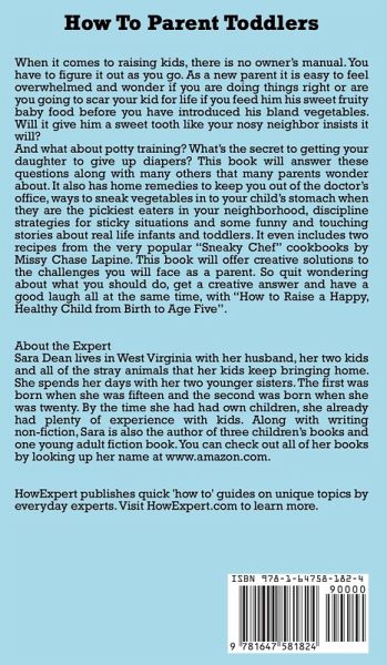 When it comes to raising kids, there is no owner's manual. You have to figure it out as you go. As a new parent it is easy to feel overwhelmed and wonder if you are doing things right or are you going to scar your kid for life if you feed him his sweet fruity baby food before you have introduced his bland vegetables. Will it give him a sweet tooth like your nosy neighbor insists it will? And what about potty training? What's the secret to getting your daughter to give up diapers? This book will answer these questions along with many others that many parents wonder about. It also has home remedies to keep you out of the doctor's office, ways to sneak vegetables in to your child's stomach when they are the pickiest eaters in your neighborhood, discipline strategies for sticky situations and some funny and touching stories about real life infants and toddlers. It even includes two recipes from the very popular "Sneaky Chef" cookbooks by Missy Chase Lapine. This book will offer creative solutions to the challenges you will face as a parent. So quit wondering about what you should do, get a creative answer and have a good laugh all at the same time, with "How to Raise a Happy, Healthy Child from Birth to Age Five". About the Expert Sara Dean lives in West Virginia with her husband, her two kids and all of the stray animals that her kids keep bringing home. She spends her days with her two younger sisters. The first was born when she was fifteen and the second was born when she was twenty. By the time she had had own children, she already had plenty of experience with kids. Along with writing non-fiction, Sara is also the author of three children's books and one young adult fiction book. You can check out all of her books by looking up her name at www.amazon.com. HowExpert publishes quick 'how to' guides on all topics from A to Z by everyday experts.