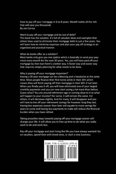 How to pay off your mortgage in 6 to 8 years: Wealth habits of the rich that will save you thousands By Joe Correa Want to pay off your mortgage and be out of debt? This book has the solution. It’s full of valuable ideas and examples that others have used to eliminate their mortgage debt in just a few years. You will learn how to minimize expenses and plan your pay off strategy in an organized and practical manner. What do banks offer as a solution? Most banks only give you one option which is basically to send your payment every month for the next 30 years. Yes, you will have paid off your mortgage by then but there’s a better way. A faster way and easier way that requires simply planning for what needs to be done. Do you have a 30 year mortgage? Do you have credit card debt? Do you make insurance and property tax payments? If you answered "yes" to any of these questions, you can seriously lower your mortgage debt and the time it takes you to pay it off. If you answered "no", there’s still other options that are explained in detail. Most books give you general ideas as to what you can do to eliminate your mortgage debt but this book shows you how it’s done with real examples and solutions. You will see how payments amortize, how much interest goes towards payments, and how much interest you will pay over the life of the loan when presented with different solutions. Why is paying off your mortgage important? Having a 30 year mortgage can be a blessing and a headache at the same time. Most people finance their first home while in their 30’s which means they will finish paying off their mortgage in their 60’s if not later. When you finally pay it off, you will have eliminated one of your largest monthly payments and you can now start saving a lot more than before. Guess what? You are around retirement age or coming close to it so what will happen to your income? For some, it will remain the same. For others, it will decrease slightly. And for many, it will disappear and you will have to live off your retirement savings for however long they last. Having less expenses sooner than later will equate to more savings for years to come and having less payments to make will reduce the financial burden when you have retired. Taking proactive steps towards paying off your mortgage sooner will change your life. It will allow you to free up time to do what you really want to do and work less. Pay off your mortgage and start living the life you have always wanted! Go on vacation, spend time with loved ones, or start a new business.