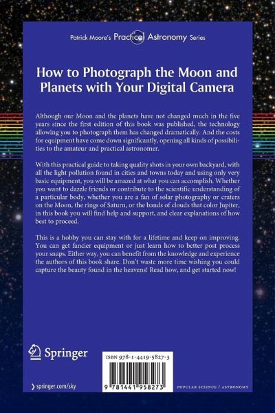 Note on the Second Edition by Philip Pugh.- Foreword by Sir Patrick Moore.- Preface.- Chapter 1: Introduction.- Chapter 2: Choosing Your Equipment.- Chapter 3: Setting Up.- Chapter 4: Photographing the Phases of the Moon.- Chapter 5: Identifiying Regions of the Moon.- Chapter 6: Techniques for Photographing the Moon.- Chapter 7: Photographing Lunar Events.- Chapter 8: Processing Lunar Images.- Chapter 9: Solar System Moons.- Chapter 10: Photographing the Planets.- Chapter 11: The Sun.- Chapter 12: Transits.- Chapter 13: And What Else?.- Chapter 14: A Few Final Words.- Appendix.- Glossary.- Index.