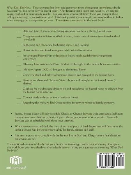What Do I Do Now? This statement has been said numerous times throughout time when a death has occurred. It is never easy to accept death. After hearing that a loved one has died, we may feel angry, confused or emotionally numb. Do you know who to call first? Have you thought about calling a mortuary, or cremation service? This book provides you a simple necessary outline to follow when starting your arrangement process. These items are covered in the work book: ___ Date and time of services (including visitation) confirm with the funeral home ___ Clergy or service officiant notified of death, date / time of service (confirmed with all involved) ___ Pallbearers and Honorary Pallbearers chosen and notified ___ Florist notified and floral arrangement(s) ordered for services ___ Pre-arranged Funeral Plan or Insurance Policy made available for arrangement conference ___ Obituary Information and Photo (if desired) brought to the funeral home or e-mailed ___ Military Papers (DD214) brought to the funeral home ___ Cemetery Deed and other information located and brought to the funeral home ___ Pictures for Memorial (Tribute) Video chosen and brought to the funeral home (if desired) ___ Clothing for the deceased decided on and brought to the funeral home or selected from the funeral home selection ___ Contact made with out of town family or friends ___ Regarding the Military, Red Cross notified for service release of family members ¿ Funeral Home Name will only schedule Chapel or Church Services with three and a-half hour intervals to ensure that every family is given the proper amount of time needed. Graveside Services can be scheduled with three hour intervals. ¿ When services are scheduled, the time of year and place of final disposition will determine the latest a service will be set to ensure safety for family, friends and staff. ¿ It is very important to consult with the Funeral Home Staff and Clergy before final decisions on services are set. The emotional element of death that your family has to manage can be over whelming. Complete this work book prior to a death or after a death before starting your journey to answering "What Do I Do Now"