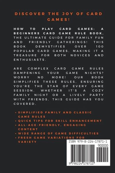 Are you searching for the perfect way to spice up family game nights? Looking for a fun and easy way to introduce kids to the joys of card games? "How to Play Card Games: A Beginners Card Game Rule Book of Over 100 Popular Playing Card Variations for Families, Kids, and Adults" is your ultimate guide to the world of card games. This book is an essential addition to any family's game collection, offering a treasure trove of card game rules that are perfect for players of all ages. Card Game Book Overview:The Basics of Card Games Card Games for Kids 8-12 Matching Card Games for Sharp Minds Family-Friendly Card Games The Ultimate Card Games Rules Book Advanced Strategies for Adult Players Quick and Easy Card Games The Classics: Rediscovering Traditional Games Creative Variations: Mixing It Up The book not only introduces you to classic games but also unveils lesser-known gems. Whether you're a seasoned player or a beginner, this comprehensive guide has something for everyone. Key Highlights:Beginner-Friendly: Tailored for beginners, this book ensures everyone can join in the fun. Wide Range of Games: From traditional favorites to exciting new variations, explore over 100 card games. Family Bonding: Find games that are perfect for family gatherings, ensuring laughter and fun for all ages. Educational Value: Card games for kids enhance critical thinking and social skills. Diverse Complexity: From simple to complex, there's a game for every mood and occasion. Why This Book Is a Must-Have:Clear, Concise Rules: Each game is explained with easy-to-understand instructions. Variety: Discover games suitable for different group sizes and ages. Skill Development: Enhance strategic thinking and memory skills. Portable Fun: Perfect for travels, camping trips, or cozy evenings at home. Don't miss out on the endless entertainment! This book is your passport to countless hours of joy and competitive spirit. Whether planning a family game night or looking to brush up on your card-playing skills, this book is your go-to resource. How to Play Card Games not only teaches you the rules but also the psychology behind winning strategies. It's more than just a rule book; it's a guide to becoming a savvy, strategic player. Act now! Dive into the fascinating world of card games and transform your game nights. Whether you're teaching your kids their first card game, hosting a game night with friends, or simply enjoying a quiet evening at home, this book is the perfect companion. With its wide range of games, "How to Play Card Games: A Beginners Card Game Rule Book of Over 100 Popular Playing Card Variations for Families, Kids, and Adults" is an invaluable resource for anyone looking to broaden their card game repertoire. It's a book that grows with you, offering more complex and challenging games as you hone your skills. Don't wait to start making memories! Grab your copy today and master easy to learn card games for you and the whole family!