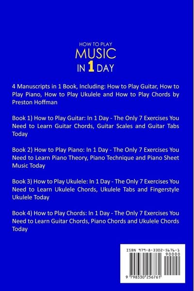 4 Manuscripts in 1 Book, Including: How to Play Guitar, How to Play Piano, How to Play Ukulele and How to Play Chords! Book 1) How to Play Guitar: In 1 Day - The Only 7 Exercises You Need to Learn Guitar Chords, Guitar Scales and Guitar Tabs Today Book 2) How to Play Piano: In 1 Day - The Only 7 Exercises You Need to Learn Piano Theory, Piano Technique and Piano Sheet Music Today Book 3) How to Play Ukulele: In 1 Day - The Only 7 Exercises You Need to Learn Ukulele Chords, Ukulele Tabs and Fingerstyle Ukulele Today Book 4) How to Play Chords: In 1 Day - The Only 7 Exercises You Need to Learn Guitar Chords, Piano Chords, and Ukulele Chords Today You have made an excellent decision by choosing to learn how to play music. So, don't delay it any longer. Take this opportunity and purchase your copy today. Order "How to Play Music: In 1 Day" Now!
