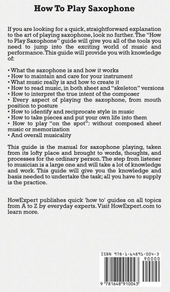 If you are looking for a quick, straightforward explanation to the art of playing saxophone, look no further. The "How to Play Saxophone" guide will give you all of the tools you need to jump into the exciting world of music and performance. This guide will provide you with knowledge of: - What the saxophone is and how it works - How to maintain and care for your instrument - What music really is and how to create it - How to read music, in both sheet and "skeleton" versions - How to interpret the true intent of the composer - Every aspect of playing the saxophone, from mouth position to posture - How to identify and reciprocate style in music - How to take pieces and put your own life into them - How to play "on the spot:" without composed sheet music or memorization - And much more This guide is the manual for saxophone playing, taken from its lofty place and brought to words, thoughts, and processes for the ordinary person. The step from listener to musician is a large one and will take a lot of knowledge and work. This guide will give you the knowledge and basis needed to undertake the task; all you have to supply is the practice. HowExpert publishes quick 'how to' guides on all topics from A to Z by everyday experts.