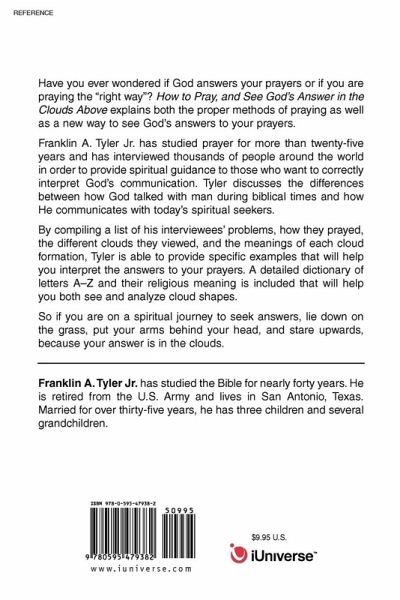 Have you ever wondered if God answers your prayers or if you are praying the "right way"? How to Pray, and See God's Answer in the Clouds Above explains both the proper methods of praying as well as a new way to see God's answers to your prayers. Franklin A. Tyler Jr. has studied prayer for more than twenty-five years and has interviewed thousands of people around the world in order to provide spiritual guidance to those who want to correctly interpret God's communication. Tyler discusses the differences between how God talked with man during biblical times and how He communicates with today's spiritual seekers. By compiling a list of his interviewees' problems, how they prayed, the different clouds they viewed, and the meanings of each cloud formation, Tyler is able to provide specific examples that will help you interpret the answers to your prayers. A detailed dictionary of letters A-Z and their religious meaning is included that will help you both see and analyze cloud shapes. So if you are on a spiritual journey to seek answers, lie down on the grass, put your arms behind your head, and stare upwards, because your answer is in the clouds.