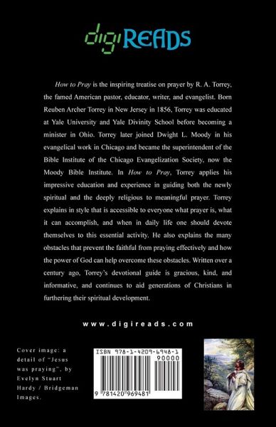 "How to Pray" is the inspiring treatise on prayer by R. A. Torrey, the famed American pastor, educator, writer, and evangelist. Born Reuben Archer Torrey in New Jersey in 1856, Torrey was educated at Yale University and Yale Divinity School before becoming a minister in Ohio. Torrey later joined Dwight L. Moody in his evangelical work in Chicago and became the superintendent of the Bible Institute of the Chicago Evangelization Society, now the Moody Bible Institute. In "How to Pray", Torrey applies his impressive education and experience in guiding both the newly spiritual and the deeply religious to meaningful prayer. Torrey explains in style that is accessible to everyone what prayer is, what it can accomplish, and when in daily life one should devote themselves to this essential activity. He also explains the many obstacles that prevent the faithful from praying effectively and how the power of God can help overcome these obstacles. Written over a century ago, Torrey’s devotional guide is gracious, kind, and informative, and continues to aid generations of Christians in furthering their spiritual development. This edition is printed on premium acid-free paper.
