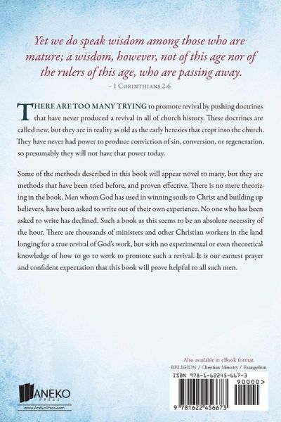 Yet we do speak wisdom among those who are mature; a wisdom, however, not of this age nor of the rulers of this age, who are passing away. – 1 Corinthians 2:6 There are too many trying to promote revival by pushing doctrines that have never produced a revival in all of church history. These doctrines are called new, but they are in reality as old as the early heresies that crept into the church. They have never had power to produce conviction of sin, conversion, or regeneration, so presumably they will not have that power today. Some of the methods described in this book will appear novel to many, but they are methods that have been tried before, and proven effective. There is no mere theorizing in the book. Men whom God has used in winning souls to Christ and building up believers, have been asked to write out of their own experience. No one who has been asked to write has declined. Such a book as this seems to be an absolute necessity of the hour. There are thousands of ministers and other Christian workers in the land longing for a true revival of God’s work, but with no experimental or even theoretical knowledge of how to go to work to promote such a revival. It is our earnest prayer and confident expectation that this book will prove helpful to all such men.