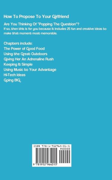 Are You Thinking Of "Popping The Question"? If so, then this is for you because it includes 25 fun and creative ideas to make that moment most memorable. Chapters include:The Power of Good Food Using the Great Outdoors Giving Her An Adrenaline Rush Keeping It Simple Using Music to Your Advantage Hi-Tech Ideas Going BIG