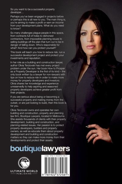 So you want to be a successful property developer... Perhaps you've been engaged in projects before or perhaps this is all new to you. The main thing is, you're aiming to make a profit or earn an income from your development plans. What do you need to know? So many challenges plague people in this space, from contracts full of holes to dishonest contractors, from impossible planning issues to selling buildings off the plan that turn out to be in danger of falling down. Who's responsible for what? And how can you protect yourself? This book will teach you how to reduce risk, run a successful development project and protect your investments and reputation. In her role as a building and construction lawyer, author Olivia Terziovski has met every project problem under the sun. Her book How to Prosper as a Property Developer is the first of its kind - the only book written by a lawyer for non-lawyers with tips on how to reduce risk in order to make more money for property developers and investors. Olivia shares her knowledge and experience unreservedly to help aspiring and seasoned property developers achieve greater profit from their projects. If you are serious about being or becoming a successful property and making money from the outset, or are just looking to build, then this book is for you. Olivia Terziovski owns and operates her own building and construction, property and planning law firm, Boutique Lawyers, located in Melbourne. She assists thousands of clients with their property development, building and construction, and planning-related issues. Her passion is to protect property developers, builders and property owners, as well as educate them about property development and building and construction matters so they can make more money from their developments and protect their assets.