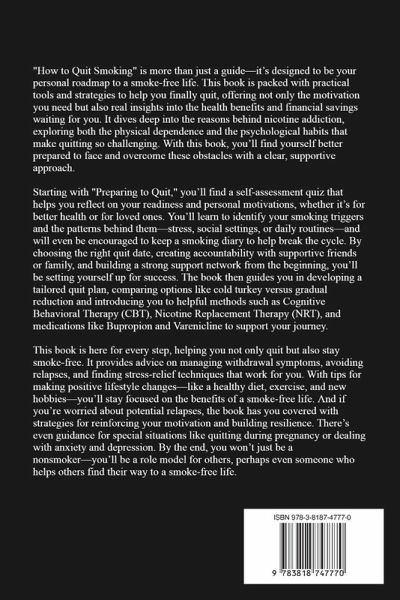 How to Quit Smoking is more than just a guide-it's designed to be your personal roadmap to a smoke-free life. This book is packed with practical tools and strategies to help you finally quit, offering not only the motivation you need but also real insights into the health benefits and financial savings waiting for you. It dives deep into the reasons behind nicotine addiction, exploring both the physical dependence and the psychological habits that make quitting so challenging. With this book, you'll find yourself better prepared to face and overcome these obstacles with a clear, supportive approach.Starting with "Preparing to Quit," you'll find a self-assessment quiz that helps you reflect on your readiness and personal motivations, whether it's for better health or for loved ones. You'll learn to identify your smoking triggers and the patterns behind them-stress, social settings, or daily routines-and will even be encouraged to keep a smoking diary to help break the cycle. By choosing the right quit date, creating accountability with supportive friends or family, and building a strong support network from the beginning, you'll be setting yourself up for success. The book then guides you in developing a tailored quit plan, comparing options like cold turkey versus gradual reduction and introducing you to helpful methods such as Cognitive Behavioral Therapy (CBT), Nicotine Replacement Therapy (NRT), and medications like Bupropion and Varenicline to support your journey.This book is here for every step, helping you not only quit but also stay smoke-free. It provides advice on managing withdrawal symptoms, avoiding relapses, and finding stress-relief techniques that work for you. With tips for making positive lifestyle changes-like a healthy diet, exercise, and new hobbies-you'll stay focused on the benefits of a smoke-free life.