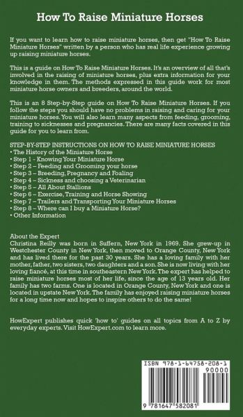 If you want to learn how to raise miniature horses, then get "How To Raise Miniature Horses" written by a person who has real life experience growing up raising miniature horses. This is a guide on How To Raise Miniature Horses. It’s an overview of all that’s involved in the raising of miniature horses, plus extra information for your knowledge in them. The methods expressed in this guide work for most miniature horse owners and breeders, around the world. This is an 8 Step-by-Step guide on How To Raise Miniature Horses. If you follow the steps you should have no problems in raising and caring for your miniature horses. You will also learn many aspects from feeding, grooming, training to sicknesses and pregnancies. There are many facts covered in this guide for you to learn from. STEP-BY-STEP INSTRUCTIONS ON HOW TO RAISE MINIATURE HORSES • The History of the Miniature Horse • Step 1 - Knowing Your Miniature Horse • Step 2 – Feeding and Grooming your horse • Step 3 – Breeding, Pregnancy and Foaling • Step 4 – Sickness and choosing a Veterinarian • Step 5 – All About Stallions • Step 6 – Exercise, Training and Horse Showing • Step 7 – Trailers and Transporting Your Miniature Horses • Step 8 – Where can I buy a Miniature Horse? • Other Information About the Expert Christina Reilly was born in Suffern, New York in 1969. She grew-up in Westchester County in New York, then moved to Orange County, New York and has lived there for the past 30 years. She has a loving family with her mother, father, two sisters, two daughters and a son. She is now living with her loving fiancé, at this time in southeastern New York. The expert has helped to raise miniature horses most of her life, since the age of 13 years old. Her family has two farms. One is located in Orange County, New York and one is located in upstate New York. The family has enjoyed raising miniature horses for a long time now and hopes to inspire others to do the same! HowExpert publishes quick 'how to' guides on all topics from A to Z by everyday experts.
