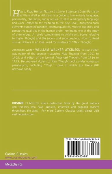 How to Read Human Nature: Its Inner States and Outer Forms by William Walker Atkinson is a guide to human body language, personality, character, and qualities. It takes reading body language and voice inflection for meaning to the next level, analyzing such elements as mental qualities, emotive qualities, relative qualities, and perceptive qualities in the human brain, reminding one of the study of phrenology. A lovely complement to Atkinson's books relating to higher thought and the super- and sub-conscious, How to Read Human Nature is an ideal read for students of "New Thought." American writer WILLIAM WALKER ATKINSON (1862-1932) was editor of the popular magazine New Thought from 1901 to 1905, and editor of the journal Advanced Thought from 1916 to 1919. He authored dozens of New Thought books under numerous pseudonyms, including "Yogi," some of which are likely still unknown today.