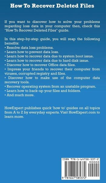 If you want to discover how to solve your problems regarding loss data in your computer then, check this"How To Recover Deleted Files" guide. In this step-by-step guide, you will reap the following benefits: - Resolve data loss problems. - Learn how to prevent data loss. - Learn how to recover data due to system boot issue. - Learn how to recover data due to hard disk issue. - Discover how to recover Office data files. - Impress your friends to recover their computer from viruses, corrupted registry and files. - Discover how to make use of the computer data recovery tools. - Recover operating system from an unstable program. - Learn how to back-up your files and folders. - And much more. HowExpert publushes quick 'how to' guides on all topics from A to Z by everyday experts.