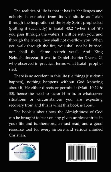 The realities of life is that it has its challenges and nobody is excluded from its vicissitude as Isaiah through the inspiration of the Holy Spirit prophesied (putting it succinctly) in Isaiah 43:2 "when (not 'if') you pass through the waters, I will be with you; and through the rivers, they shall not overflow you. When you walk through the fire, you shall not be burned, nor shall the flame scorch you." And King Nebuchadnezzar, it was in Daniel chapter 3 verse 24 who observed in practical terms what Isaiah prophesied. There is no accident in this life (i.e things just don't happen), nothing happens without God knowing about it, He either directs or permits it (Matt. 10:29 & 30), hence the need to factor Him in, in whatsoever situations or circumstances you are expecting recovery from and this is what this book is about. The book is about how the Almightiness of God can be brought to bear on any given unpleasantries in your life and is, therefore, a must read, and a good resource tool for every sincere and serious minded Christian.