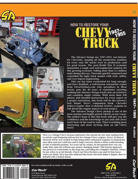 The photos in this edition are black and white. Everything you need to completely restore your 1947-1955 first series Chevy pickup to better-than-new condition is shown in complete detail! The Advance Design era (1947-1955) was historic for Chevrolet, topping all the production numbers every year they were in production. And for good reason. The post-World War II economy demanded a tough and well-engineered solution for this growing economy. Selling more than 2.5 million units during this era, Chevrolet quickly surpassed and controlled the light-truck market with style, utility, and logical engineering. This era has been overlooked for long enough, and Deve Krehbiel, a well-known restoration expert from DevesTechNet.com who specializes in these trucks, puts his 40 years of experience restoring nothing but Advance Design trucks into an extensive and complete single volume. With more than 500 photos and detailed instruction for every aspect of a proper restoration, this book will be the restorer's best friend. Deve's companion book, Chevrolet Inline 6 Engine: 1929-1962 (SA455), explains in full detail the engine aspects of your project. The Advance Design Chevy pickup is one of the most popular and highly prized vehicles at any venue. The author's hope is that this book will give you the confidence and the knowledge to put your old Chevy truck back on the road in style. There is just nothing more interesting and more inviting than an old Chevy truck!