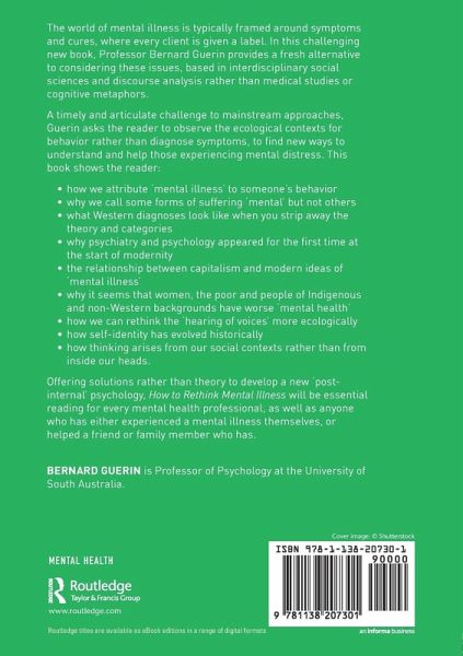 The world of mental illness is typically framed around symptoms and cures, where every client is given a label. In this challenging new book, Professor Bernard Guerin provides a fresh alternative to considering these issues, based in interdisciplinary social sciences and discourse analysis rather than medical studies or cognitive metaphors. A timely and articulate challenge to mainstream approaches, Guerin asks the reader to observe the ecological contexts for behavior rather than diagnose symptoms, to find new ways to understand and help those experiencing mental distress. This book shows the reader: how we attribute 'mental illness' to someone's behavior why we call some forms of suffering 'mental' but not others what Western diagnoses look like when you strip away the theory and categories why psychiatry and psychology appeared for the first time at the start of modernity the relationship between capitalism and modern ideas of 'mental illness' why it seems that women, the poor and people of Indigenous and non-Western backgrounds have worse 'mental health' how we can rethink the 'hearing of voices' more ecologically how self-identity has evolved historically how thinking arises from our social contexts rather than from inside our heads. Offering solutions rather than theory to develop a new 'post-internal' psychology, How to Rethink Mental Illness will be essential reading for every mental health professional, as well as anyone who has either experienced a mental illness themselves, or helped a friend or family member who has.¿