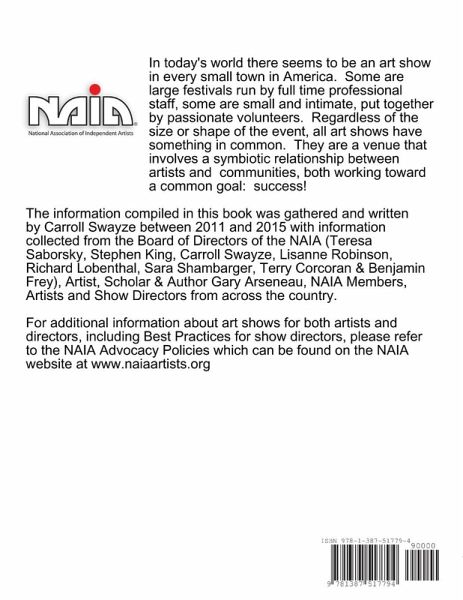 Written in 2014 by the NAIA, "How to Run a Great Art Show is a small "how to" book for art shows and festivals to help smaller shows, ones with an all volunteer staff or ones whose directors change every year, work to create an event that is successful for both the artists who come to participate and for the community and the organization producing the event.