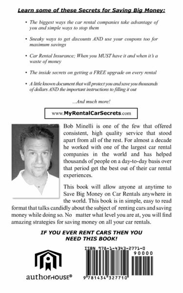 This book will allow anyone at anytime to SAVE BIG MONEY on car rentals anywhere in the world. A simple, easy to read format that talks candidly about the subject of renting cars and saving money doing so. Written by Bob Minelli, an agency operator of one of the largest car rental companies in the world for over nine years, he is now opening up the doors of unknown secrets that the industry doesn't want you to know. A must read for anyone that is thinking of renting cars and those that rent on a continuous basis. No matter what level you're at, you will find amazing strategies for saving money on car rentals.
