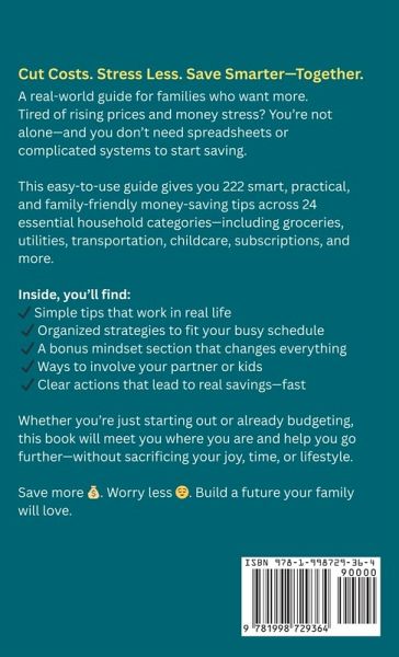 Save More. Stress Less. Take Control-One Smart Tip at a Time. Managing money today isn't easy-especially for families. The cost of groceries, utilities, child care, gas, and just about everything else keeps rising. You're trying to do the right thing-budget smarter, plan ahead, maybe even save for the future-but it feels like you're always falling behind. You're not alone-and the truth is, most families were never taught how to save money effectively. You need more than generic advice. You need a roadmap that works in real life. And the worst part? Most resources are either overwhelming or unrealistic. Some are too technical. Others are out of touch with what it's like to raise a family, juggle responsibilities, and make every dollar count. You don't need spreadsheets. You need solutions that make sense in the middle of your busy life. Because this isn't just about money-it's about your peace of mind, your ability to plan ahead, and the kind of life you want to create for your family ¿¿. That's where this book comes in. This ultimate guide with 222 top tips on saving money is your go-to money saving tips book for real families who want to stop stressing and start saving-without sacrificing joy, quality of life, or precious time. Inside, you'll find: (1) 222 creative, practical, and proven money-saving tips (2) Organized into 24 essential household categories (like groceries, utilities, transportation, insurance, childcare, subscriptions, clothing, and more) (3) A bonus section on mindset: "Needs vs. Wants-The One Habit That Changes Everything" (4) Simple, family-friendly tips you can start using today (5) No fluff-just real-world strategies that deliver real savings This isn't a one-size-fits-all approach. It's a flexible toolkit that helps you cut unnecessary expenses, build smarter habits, and save money in the areas that matter most to your family. Whether you're looking for a how to save money book, a guide packed with saving money tips, or a new way to turn everyday decisions into long-term wins-you're in the right place. You'll learn how to: ¿¿ Spot hidden costs and reduce waste ¿¿ Reorganize your budget with confidence ¿¿ Apply simple, powerful money-saving tips across your home and lifestyle ¿¿ Feel empowered and in control of your financial choices Whether you're just starting out or already cutting costs, this book will meet you where you are-and help you go further. Because saving isn't just about money-it's about what that money can do for your peace of mind, your future, and your family. ¿¿ Scroll up and click "Buy Now" to access the top tips on saving money that real families are using to stretch income, live better, and thrive in any economy. The tools are here. The change starts with you. Let's go.