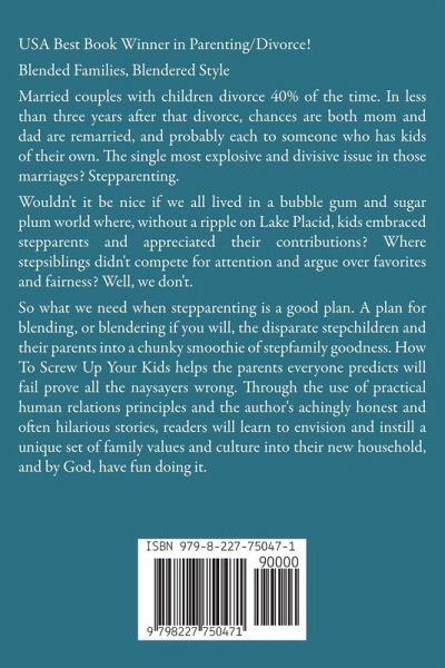 USA Best Book Winner in Parenting/Divorce! Blended Families, Blendered Style Married couples with children divorce 40% of the time. In less than three years after that divorce, chances are both mom and dad are remarried, and probably each to someone who has kids of their own. The single most explosive and divisive issue in those marriages? Stepparenting. Wouldn't it be nice if we all lived in a bubble gum and sugar plum world where, without a ripple on Lake Placid, kids embraced stepparents and appreciated their contributions? Where stepsiblings didn't compete for attention and argue over favorites and fairness? Well, we don't. So what we need when stepparenting is a good plan. A plan for blending, or blendering if you will, the disparate stepchildren and their parents into a chunky smoothie of stepfamily goodness. How To Screw Up Your Kids helps the parents everyone predicts will fail prove all the naysayers wrong. Through the use of practical human relations principles and the author's achingly honest and often hilarious stories, readers will learn to envision and instill a unique set of family values and culture into their new household, and by God, have fun doing it.