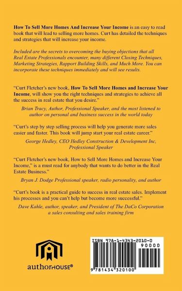 "How To Sell More Homes And Increase Your Income" is an easy to read book that will lead to selling more homes. Curt has detailed the techniques and strategies that will increase your income.Included are the secrets to overcoming the buying objections that all Real Estate Professionals encounter, many different Closing Techniques, Marketing Strategies, Rapport Building Skills, and Much More. You can incorporate these techniques immediately and will see results.