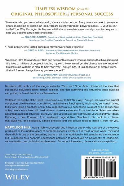 Napoleon Hill schrieb, der Zweck dieses Buches ist, praktische Information und Erfahrungen von 100 erfolgreicher Menschen zu sammeln und an Neulinge weiterzugeben, damit sie lehren sich im Leben gut zu verkaufen. Auto-Suggestion, Ihr erster Schritt in Salesmanship - "Das Qualifying" Ihre potentiellen Käufer - Neutralisierung Ihre Buyer's Mind - Die Angewohnheit mehr zu tun als das für das man bezahlt wird - Wie man seine Zeit einteilt - Ihr Masterplan für das Erreichen einer Position